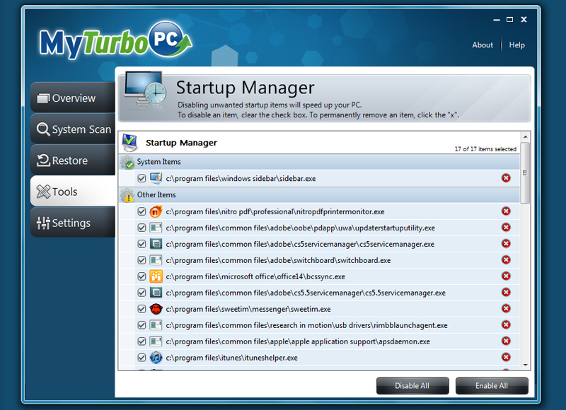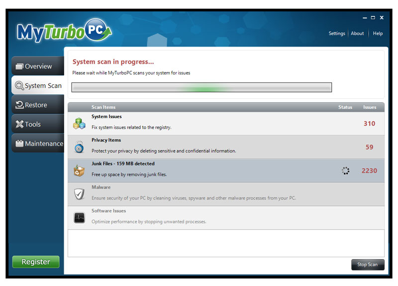 With MyTurboPC you can run a full system scan, evaluating everything from your Windows system registry to Internet privacy files, active and startup processes and drivers. |