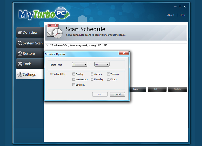 Create a regular schedule on which MyTurboPC will scan your system for performance issues and security threats. |